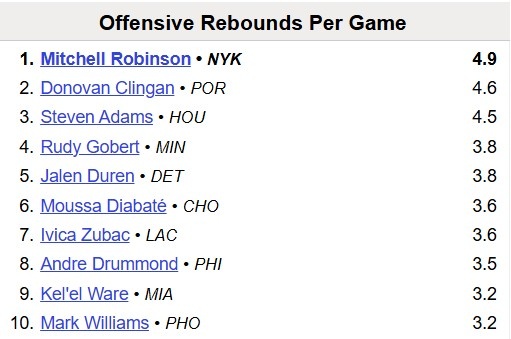 此外据统计,亚当斯每场可以抢下4.5个前场板,这一数据排名联盟第3。